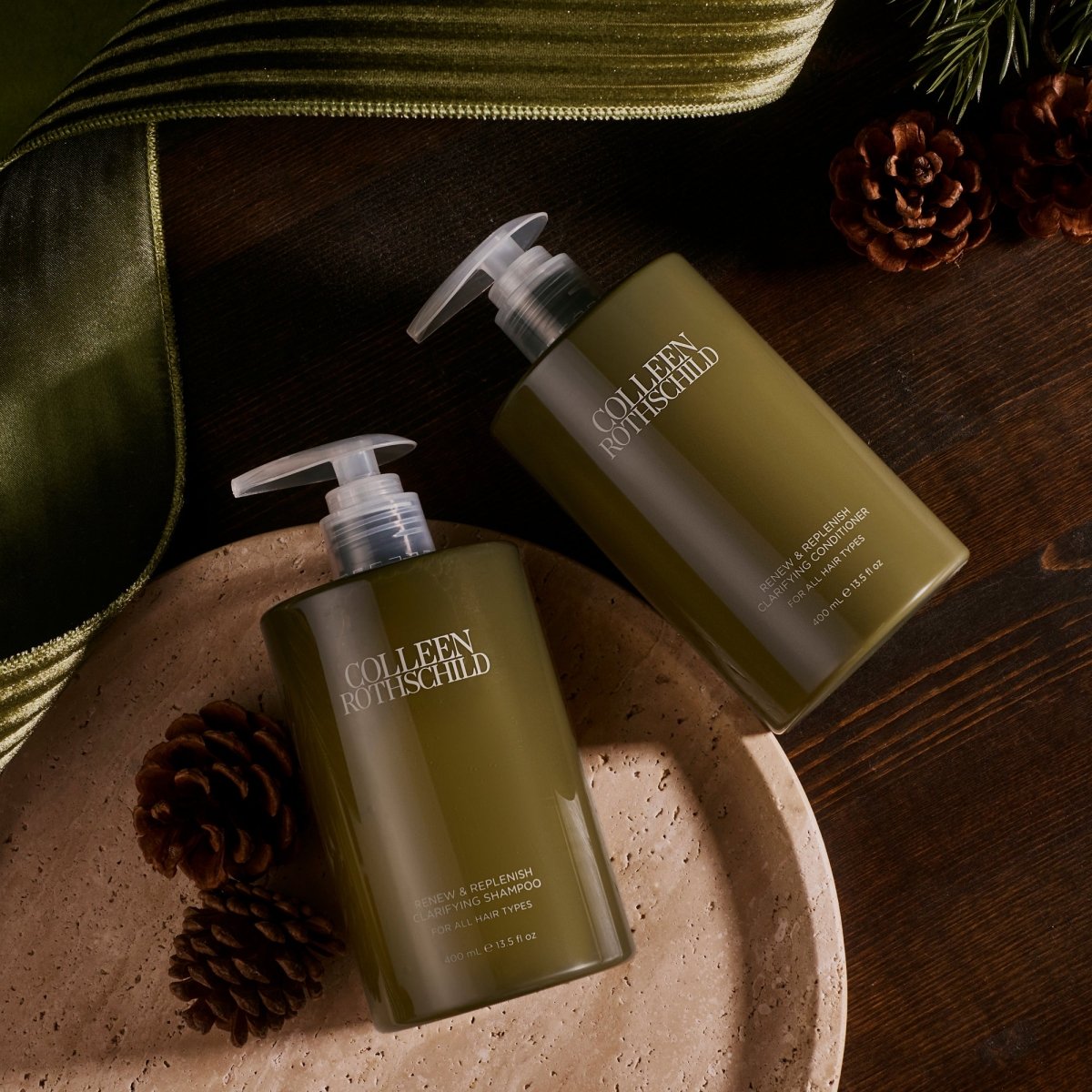 The Renew & Replenish Clarifying Shampoo & Conditioner feature a fresh, effervescent green scent. Notes of rosemary, bergamot, and green tea are balanced with a delicate hint of neroli, creating a clean, uplifting, and energizing experience.