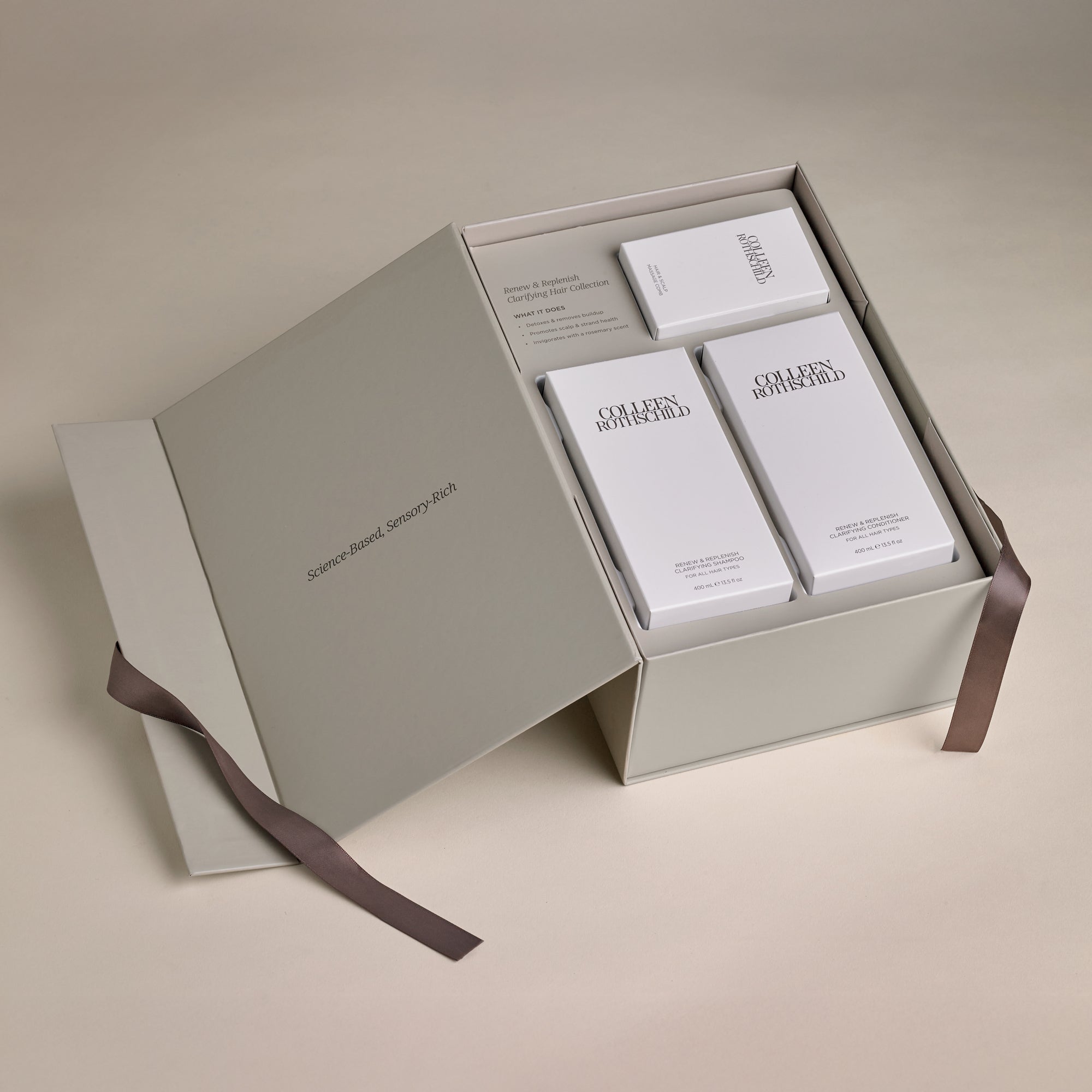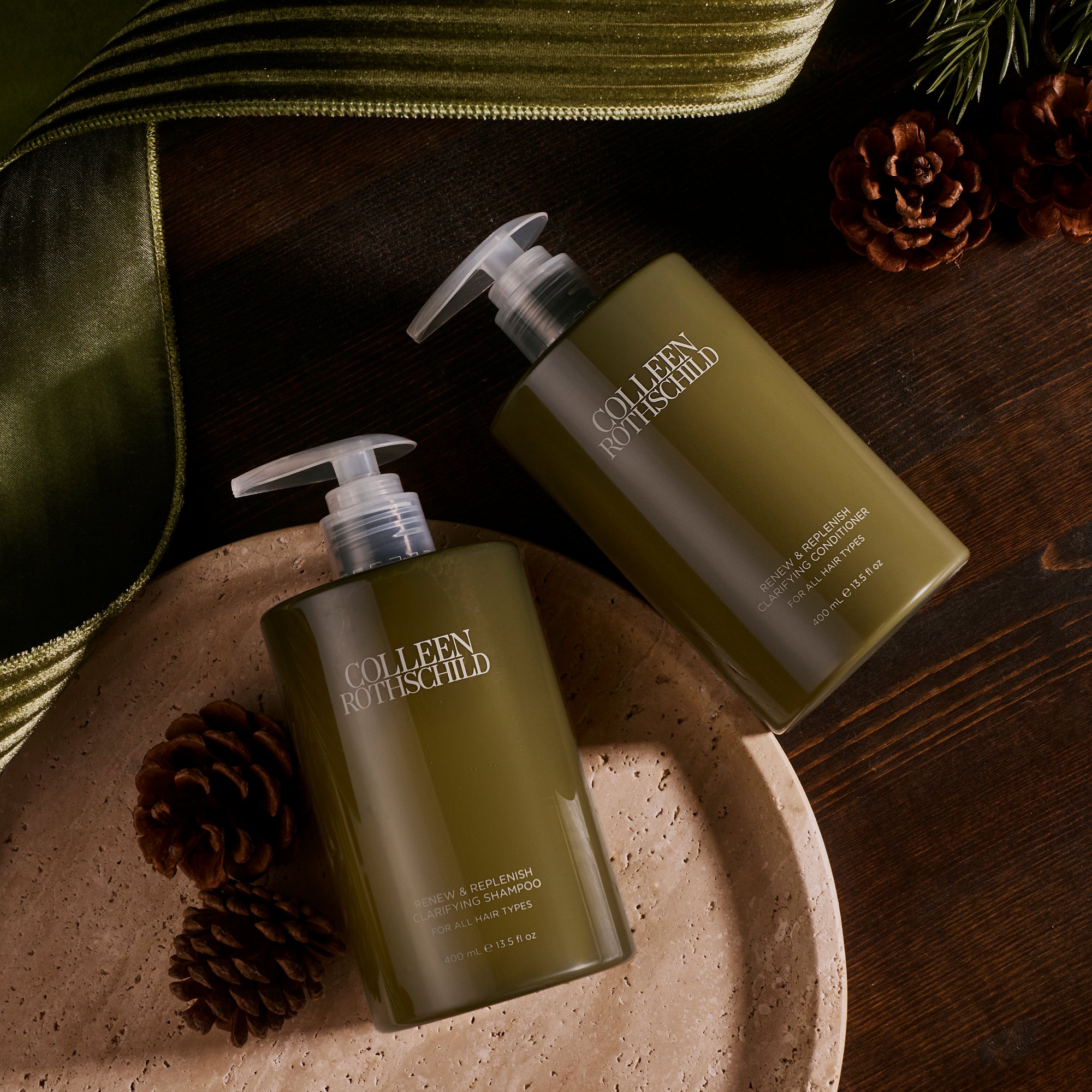 Renew & Replenish Clarifying Conditioner: WATER (AQUA), CETEARYL ALCOHOL, BEHENTRIMONIUM CHLORIDE, VITIS VINIFERA (GRAPE) SEED OIL, GLYCERYL STEARATE SE, CETRIMONIUM CHLORIDE, ACETYL TETRAPEPTIDE-3, GLYCERIN, BUTYROSPERMUM PARKII (SHEA) BUTTER, PERSEA GRATISSIMA (AVOCADO) OIL, LACTOBACILLUS/PORTULACA OLERACEA FERMENT EXTRACT, SODIUM PCA, SODIUM LACTATE, COPPER GLUCONATE, ZINC GLUCONATE, FRAGRANCE, BIOTIN, CAMELLIA SINENSIS LEAF (GREEN TEA) EXTRACT, URTICA DIOICA (NETTLE) EXTRACT, ROSMARINUS OFFICINALIS (ROSEMARY) LEAF EXTRACT, EUCALYPTUS GLOBULUS LEAF EXTRACT, ARGININE, MAGNESIUM ASPARTATE, PCA, GLYCINE, ALANINE, SERINE, VALINE, PROLINE, THREONINE, ISOLEUCINE, HISTIDINE, PHENYLALANINE, GLUCONOLACTONE, SODIUM BENZOATE, SILICONE QUATERNIUM-8, TRIDECETH-10, DIMETHICONE, DIMETHICONOL, STEARAMIDOPROPYL DIMETHYLAMINE, LACTIC ACID, ASPARTIC ACID, MENTHYL LACTATE, PHENOXYETHANOL.